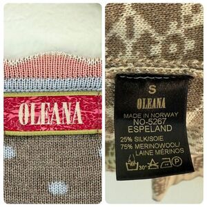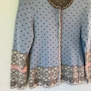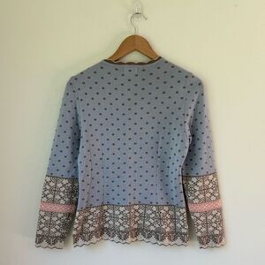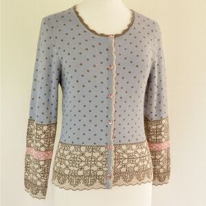 This beautifully detailed cardigan from Oleana is a true work of art. Made in Norway, the Espeland style features a charming polka dot knit in soft sky blue and taupe, contrasted with intricate Scandinavian-inspired floral and lace trim at the cuffs and hem. Finished with scalloped edges and sparkling crystal buttons, this cardigan blends playful whimsy with elevated craftsmanship. Made from a luxurious blend of 75% merino wool and 25% silk, it offers lightweight warmth and a soft, comfortable feel. Perfect for layering, this cardigan is a standout piece for any wardrobe. Preowned with tiny snag at chest as pictured. Approximate Measurements: Pit to pit: 17", length: 23", shoulder seam to shoulder seam: 13.25", sleeve length: 23".