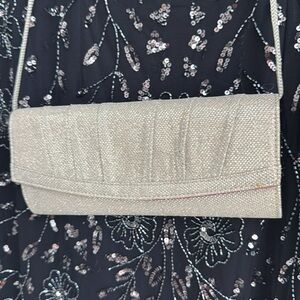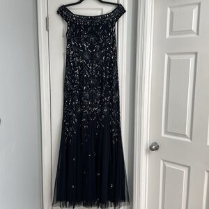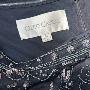 Oleg Cassini gown perfect for a wedding! Beautiful beading that cascades down as the dress flutes out. It’s a dark blue bordering on gray color. Mermaid-esque - more fitted at the top. The straps hit at the shoulders. There are a few missing beads but nothing noticeable. Bonus silver purse included 🍾