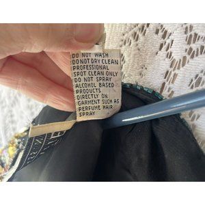 Oleg Cassini Black Tie Black Vintage 100% Silk Beaded Sequined 80s 90s Dress 10. This dress is preowned and in good condition. Please note that there are areas where the sequins will need replaced or repaired. Most are in the shoulder area as shown in the photo. I'm assuming this was probably from a purse strap. Shoulders are padded. Sleeves are sheer with slit at the wrist.Approx measurements are: