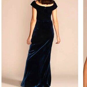Luxurious velvet brings Old Hollywood glamour to this off-the-shoulder gown, perfect for that special occasion. The smooth fabric gathers at the waist to reveal a ruffled skirt slit.