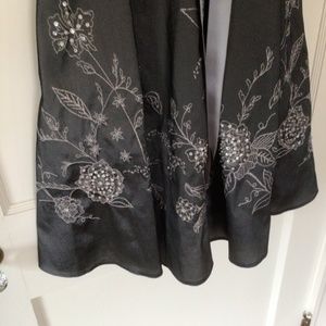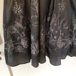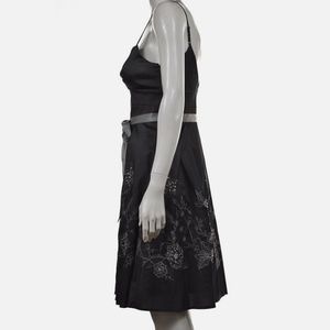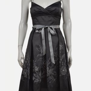 Absolutely stunning fit and flare dress from Oleg Cassini comes to you loaded with features. Charcoal Chintz fabric is embroidered and embellished with floral design accented by silver and gray sequins and beading. Adjustable spaghetti straps and a Vneck design. Built in bra, satin tie at waist. Hits just at the knee.