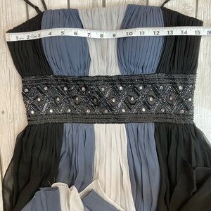 Pleated scarf panels with beaded empire waist.