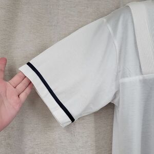 Crisp White with Navy contast on inner collar and sleeve cuffs
