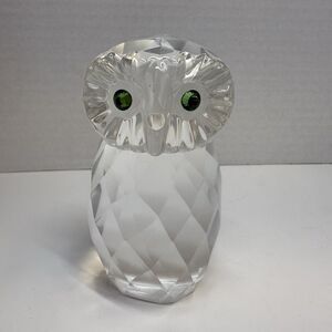 Crystal owl with green crystal eyes by Olay Casini. This would make a great gift for the owl lover. Measures approximately 3.5 inches tall and 2 inches wide. In excellent condition with what looks like a small little speck near its nose. Comes in original box. Comes from a smoke free home.