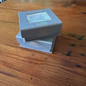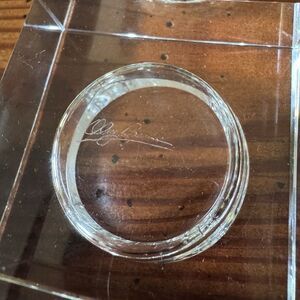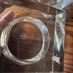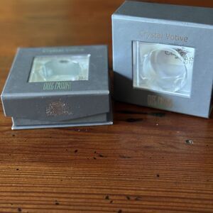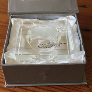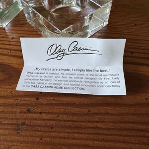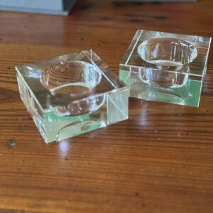 Pair of signed Oleg Cassini crystal tea ight votives. Beautiful modern, crystal clear 2 1/2 in square by 1 inch tall votives. They each come in their own satin lined box with original insert. I see no flaws, and there is no evidence these have ever been used. Please see photos for details.