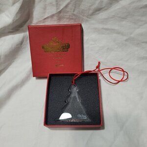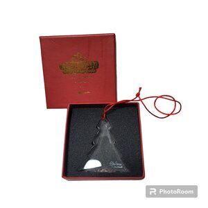 The Oleg Cassini Signed Crystal Tree Ornament is an exclusive piece from the Empire City Casino in Yonkers, featuring a small size and a clear color. This original ornament, part of a holiday collection, showcases a solid pattern and is a perfect addition for Christmas decor. With a production style of art glass, this signed ornament by Oleg Cassini adds a touch of elegance to any holiday display.
