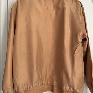 100% Silk, shoulder pads, side pockets, elastic waist and sleeves front zipper