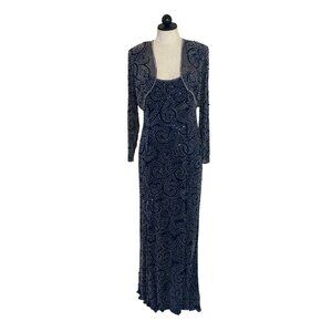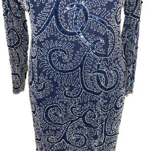 Oleg Cassini Vintage Womens Dress Jacket Set Size 10 Blue Beaded Slip Pure Silk
