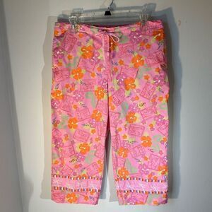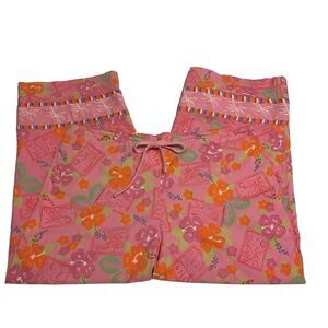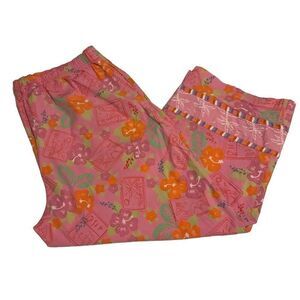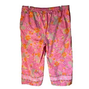 Oleg Cassini Weekend Pull On wide Leg Capri Pants, Large adjustable elastic waist tie, pockets. Beachy, pink postcard print with contrasting stripes at hem. So pretty, so fun! Wish you were here! 97% cotton 3% spankex. Flat lay 17” W, 31” L, 11” R, 20” I, 9” Ankle. #preppy #countryclub #postcards