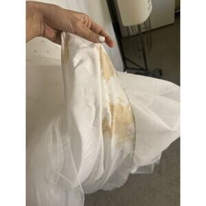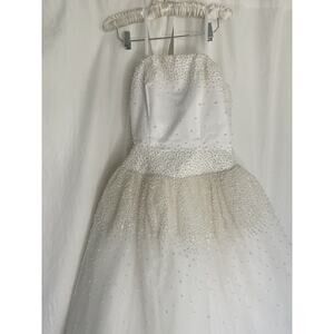 This stunning wedding dress designed by Oleg Cassini features a beautiful satin bodice and a full-length tulle skirt with intricate beading detailing. The dress comes in a size 8 and is perfect for any bride-to-be looking for a timeless and elegant look on her special day. The dress is sleeveless and the color is a classic white, making it a perfect fit for any wedding theme or style.this dress will make you feel like a true princess. White with adjustable spaghetti straps. Pearls on top and full around waist.