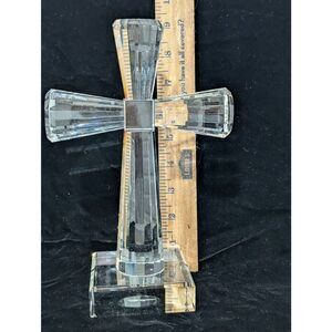 This Oleg Cassini signed crystal cross ornament showcases a vintage prism-cut design that sparkles with light. Set on a square base, it reflects timeless elegance and refined craftsmanship. Perfect as a collectible or decorative piece, it brings a graceful, spiritual charm to any space.