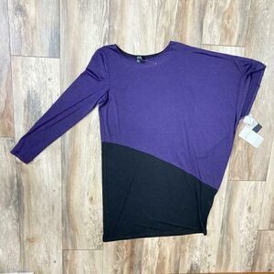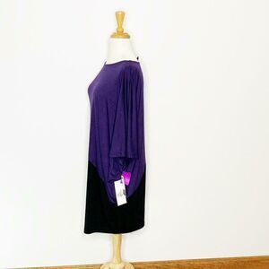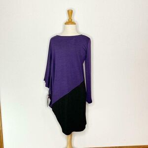 Beautiful asymmetric purple and black color blocked knee length dress with one sleeve--the other side drapes elegantly.