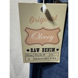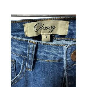 This is a pair of Olevey bootcut jeans for juniors in size 3 with a high rise waist of 28 inches. The jeans are in a blue color and have a medium fabric wash. They feature a 5-pocket design and have a 33-inch inseam. The closure is either zip or button. The brand is Olevey, and the jeans were made in China. (Bin AD)