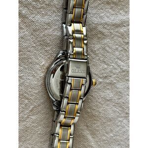This two-tone women's watch by Olevs features a stainless steel band and gold-tone bezel with a white dial. It has a day and date feature and is water resistant. The band is adjustable to a smaller size by removing links in the bracelet.