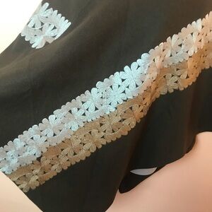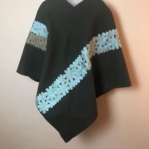 Gogo Folklore Olga Fisch Brown Cream Floral Embroidered Wool Poncho Women OS. Hand made in Ecuador. Beautiful felted brown wool with contrasting tan and cream floral embroidery throughout the front and back. Buttons along the neckline. Open size. Measures about 32” long and 38” wide with an 8” neck opening. From a non-smoking home.