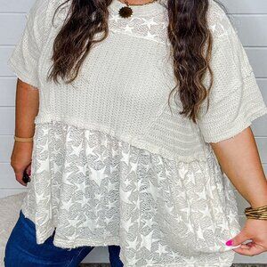 This beautiful top has bell sleeves and lace contrast