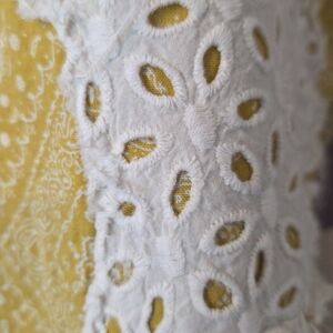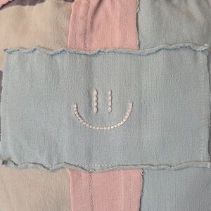 Charming patchwork top with floral and striped designs. Features pink, yellow, blue, and cream colors.