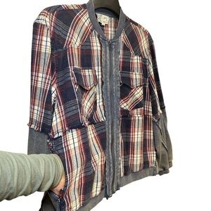 Unique patchwork style jacket in excellent new condition. Features a mix of plaid flannel panels with raw edges and soft washed sweatshirt contrast fabric. Full zip front, two large chest pockets, ribbed trim, and relaxed oversized fit. Measurements: 30” pit to pit, 23” long. Tagged medium but fits oversized.