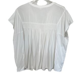 This Oli & Hali white smocked boxy oversized tunic blouse in size S/M is a stylish and versatile piece perfect for casual occasions. Made from 100% cotton, this blouse features a relaxed fit with a V-neck and short cap sleeves. The minimalist smocked accents add a touch of bohemian flair, making it easy to create a capsule wardrobe with basic and lightweight tops. Ideal for the summer, fall, and spring seasons, this breathable and moisture-wicking blouse is a must-have for women looking for a comfortable and trendy garment.