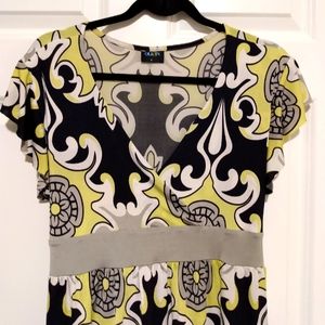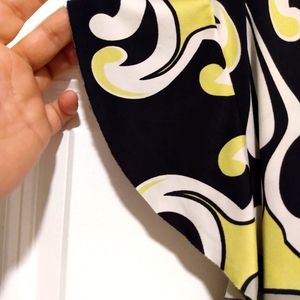 Olian polyester and spandex dress XL. Apparently this is a maturnity dress, but I think anyone can wear this cute comfortable dress. Raw hem cap sleeves, big bow tie back. Bold print in yellow, gray, black and white with a blue, green and yellow wide trim hem. Safety pined at the breast. There's a number of minor snags . Otherwise, gently worn.