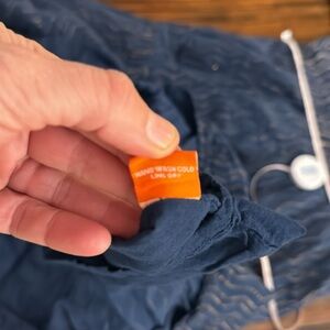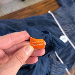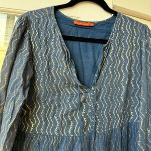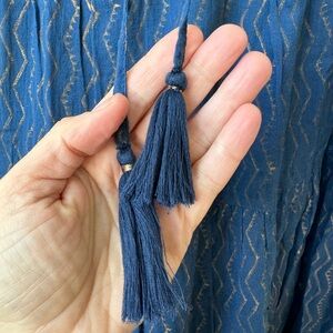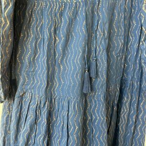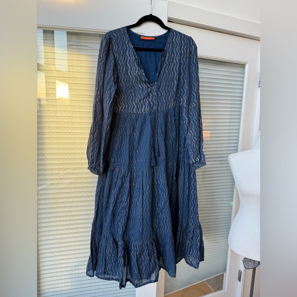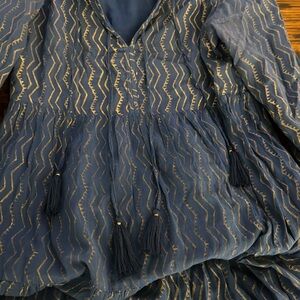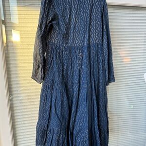 Long sleeve midi tiered lined dress. Navy and gold pattern. Very good condition with the colors faded throughout as it’s meant to be. This is not from wear. Lined. 4 tasstles