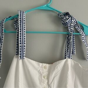 Oliphant Midi Tiered Button Dress with Bow Sleeves Blue and White Pattern