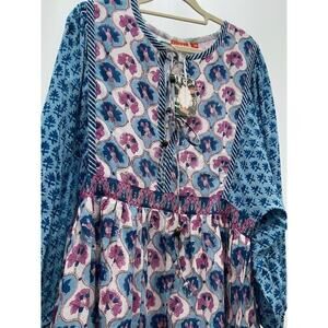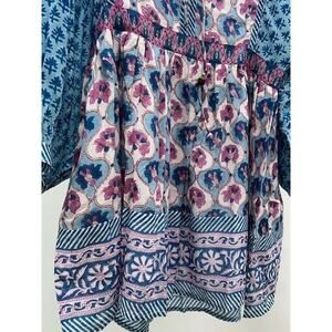 Oliphant Mini Dress Long Balloon Sleeves Tie Front Floral Fern Blue Small NWT