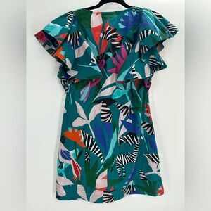 Vibrant dress with a zebra print design. Minor flaw (faded spot) on left sleeve. See photos! Hard to notice when on and otherwise in great condition. Smoke free home!