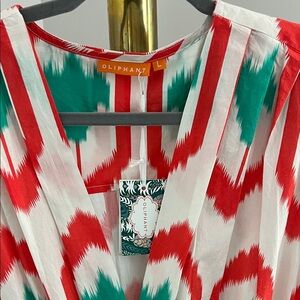 Striking geometric dress by Oliphant. Features Coral and greenish turquoise ikat patterns on slightly off white background. Ideal for making a statement.