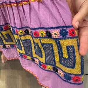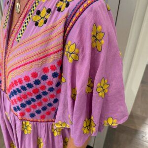 This stunning dress is so soft and comfortable and is just strikiing! The colors and embroidered flowers are just effortlessly boho chic! This dress is so fun and I have only work a few times, but cannots ay enough about how flattering and beautiful the color combination is on everyone! I wish it still fit me, but I hope someone else will get lots of wear out of this gorgeous dress!