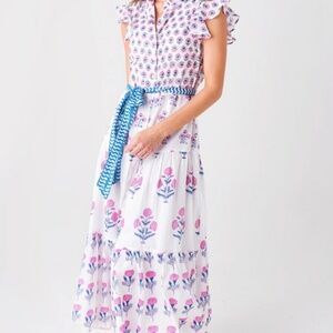 Oliphant Ruffle Collar Button Maxi Dress featuring a mixed floral hand-block print, with tie belt, size medium, excellent condition! (*very similar to dress in the photo on the model, but not exact)