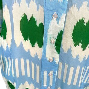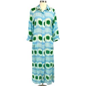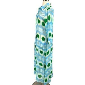 Oliphant Shirt Dress Midi Ikat Blue Green Size L Long Sleeve Cotton Silk *FLAW*