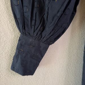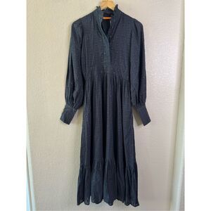 This dress has a prairie style with bottom tier ruffle. Long maxi length with long sleeves. Balloon style sleeves have buttons at wrists. Front button closure at chest. High neckline. Color is black (midnight) with gold metallic accents throughout. Dress is lined. Side zippered closure.