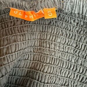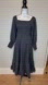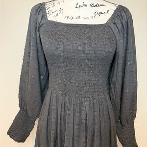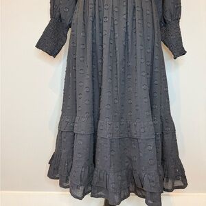 This stunning black (almost looks charcoal gray) dress by Oliphant features a square neckline and 3/4 bishop sleeves, perfect for a wedding guest or cocktail event. The dress showcases a smocked waist and tiered ruffled layers, adding volume and elegance to its flowy silhouette.