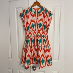 Oliphant Smocked Waist Mini Dress in Odisha Coral Print Women's Sz S Orange Teal