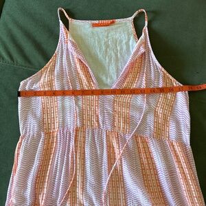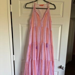 Oliphant coral pink and white block print tiered cotton tassle tie maxi dress S