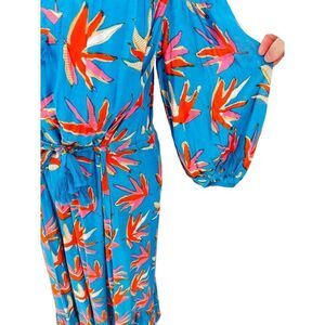 Turn heads with this vibrant Oliphant maxi dress in size XS. Featuring a bold tropical floral print in hues of orange, pink, and white on a striking turquoise background, this flowy dress is perfect for a vacation getaway, beach wedding, or summer party. The lightweight fabric, elastic cuffs, and bohemian tassel tie belt add flair and comfort, while the notched split neckline brings a refined touch. Dress is in great condition, with one tiny area of light fading as referenced in photos; barely noticeable, but otherwise exquisite condition!