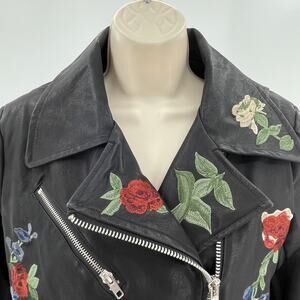 Olivaceous Black Faux Leather Embroidered Floral Asym Zip Retro Moto Jacket L