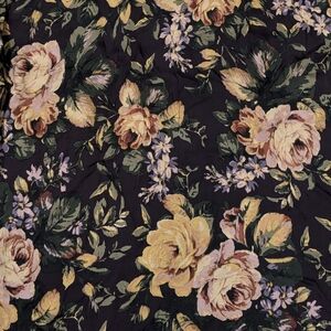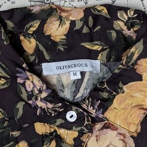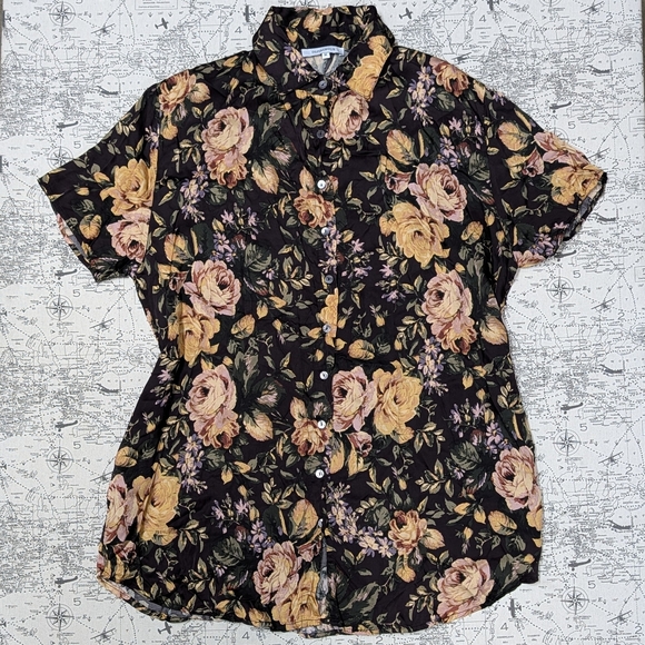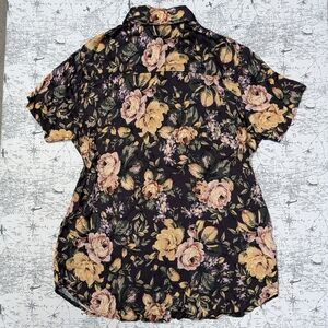 Elegant tunic style black button up blouse with apricot and pink floral print. Features mother of pearl buttons and pockets. Made of 53% viscose and 47% rayon. Previously owned. No pilling, stains, rips or snags.