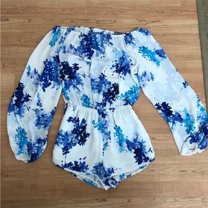 Olivaceous Blue Floral Off The Shoulder Long Sleeve Romper Size M