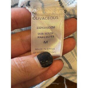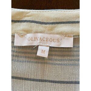 This blouse from Olivaceous is in excellent condition. It is in blue, white and gray colors in an allover striped print. It features; a mandarin collared neckline, button-down front with tie front waistline, short sleeves, semi-sheer & lightweight fabric, patch chest pocket and is crafted from 100% viscose.