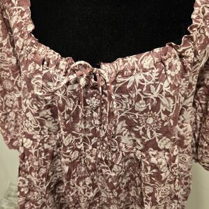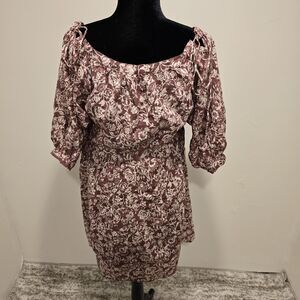 Olavaceous Baby Doll Dress. Mini length. Puff sleeves. Maroon purple floral pattern.