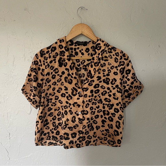 Chic button-down with bold leopard pattern. Short sleeves and classic collar.