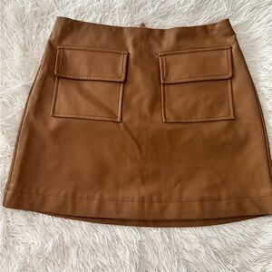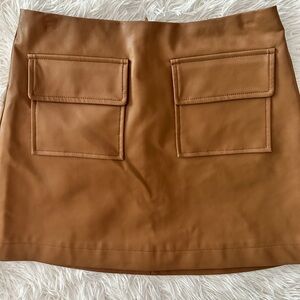 Olivaceous Faux Leather Mini Skirt – Camel Tan Utility Pockets, Size Small