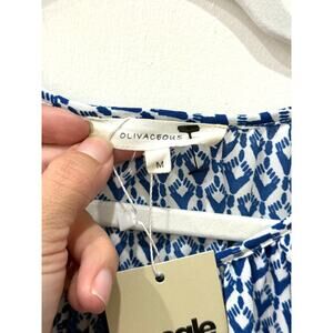 Olivaceous Geometric Print Tasseled Neck Blouse Boho Blue Women's Size Medium