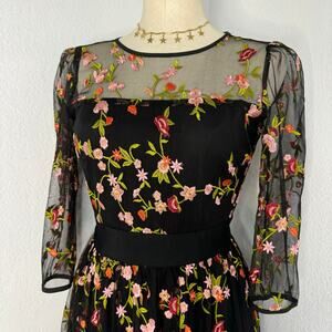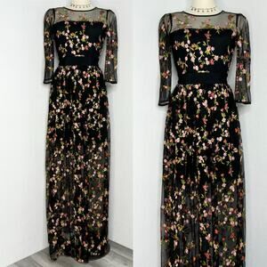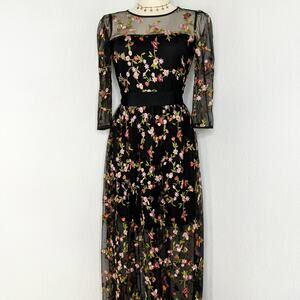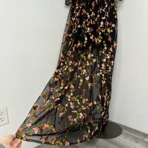 Whimsical & romantic black mesh maxi dress with all-over multicolor floral embroidery. Features sheer half sleeves and neckline with a sweetheart illusion bodice and a lined body underneath. Feminine fit and flare silhouette that flows beautifully. Perfect for weddings, date nights, or cottagecore vibes, Size Small fits like an XS