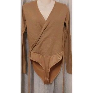 Olivaceous Lt Brown Soft Faux Wrap Bodysuit V Neck L Tie Lightweight Sweater