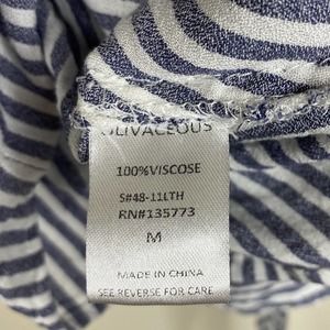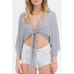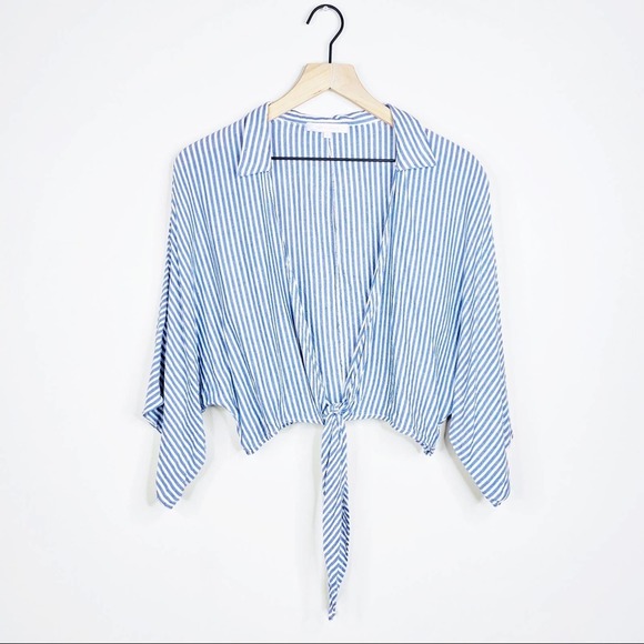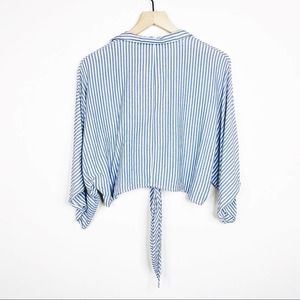Olivaceous (from Lulus) blue & white striped tie-front blouse. Features oversized, wide sleeves (kimono style) & a spread collar. Plunging neckline in front, perfect for wearing with a bralette or over a bathing suit. Stock photo shows it tied up high, can also be worn tied lower to hide stomach and worn with a looser fit.