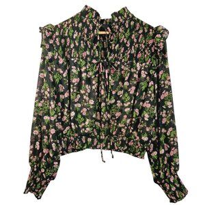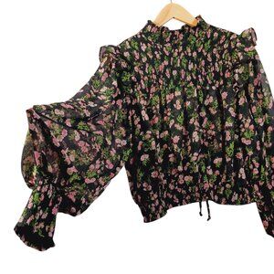 Olivaceous Medium Top, Floral, Ruffled, Smocked, Cottage Core, Boho, Blk/Green/Pink. Stretch bottom. 100% Polyester, very light weight. Two tie closures on the top back. Gorgeous balloon sleeves. Smocking across the chest and sleeve ends, ruffled shoulder detail, all on a beautiful floral print. Excellent pre-owned condition.