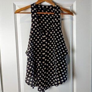 Cute racer back silk top with ruffle detail and hidden button-front placket from Olivaceous in black and beige polka dot print.